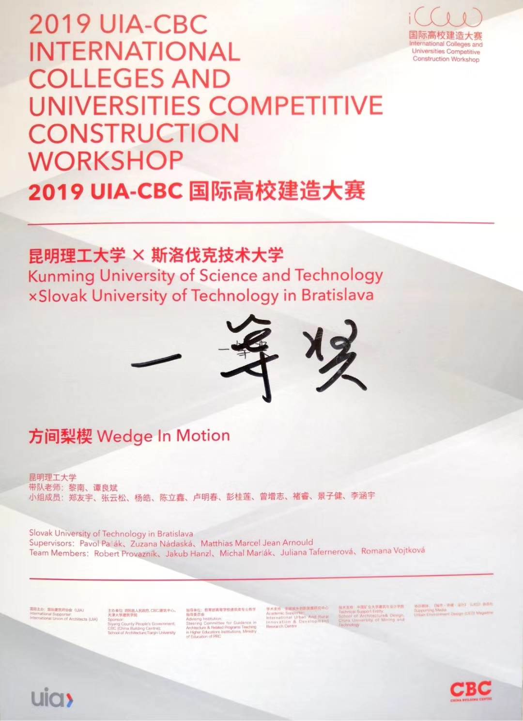 由黎南、谭良斌两位老师带队,郑友宇、张云松、杨皓、陈立鑫、卢明春、彭桂莲、曾增志、褚睿、景子健、李涵宇等10位同学参加,与斯洛伐克技术大学由Matthias Marcel Jean Arnould(斯洛伐克技术大学建筑系博士生)带队,Robert Provaznik、Jakub Hanzl、Michal Mar?ák、Juliana Tafernerová、Romana Vojtková等5位同学参加,共同组成的联合团队建造作品“方间梨楔”以第一名的成绩获得一等奖。在前三届的建造大赛中,红桃视频