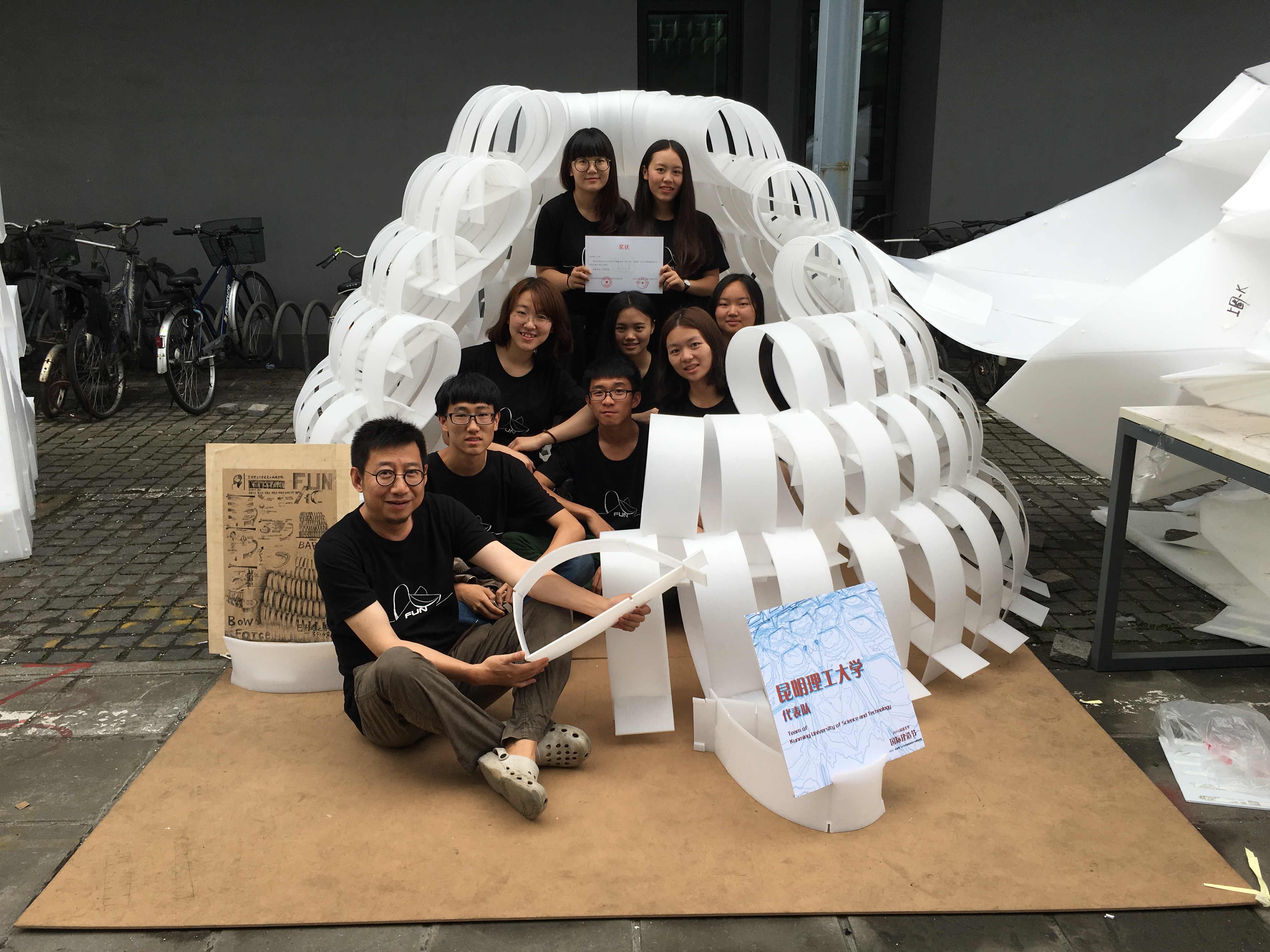 下午5点,58栋风格迥异的中空板建筑矗立在学院广场。参赛作品表现的创意让观众称赞不已:西安建筑科技大学的作品,运用了大大小小的彩色环,象征着孩童时代的天真与欢乐;德国魏玛包豪斯大学的作品,通过中空板的拉伸弯曲,空间可开可合;昆明理工大学的作品不用螺丝,完全采用中空板的自身特性,通过单元体的咬合形成空间;西班牙加泰罗尼亚理工大学的作品把文远楼前的大树利用了起来,将自然界与建造节合二为一;每个参赛高校都展现了不同的创意和设计理念。