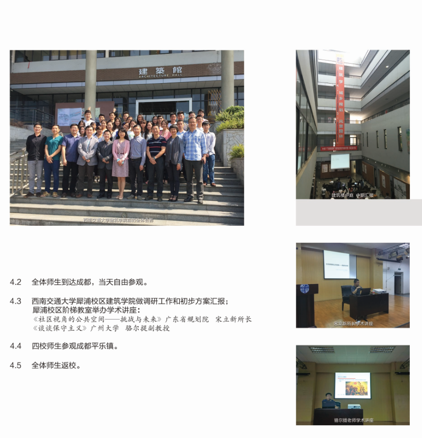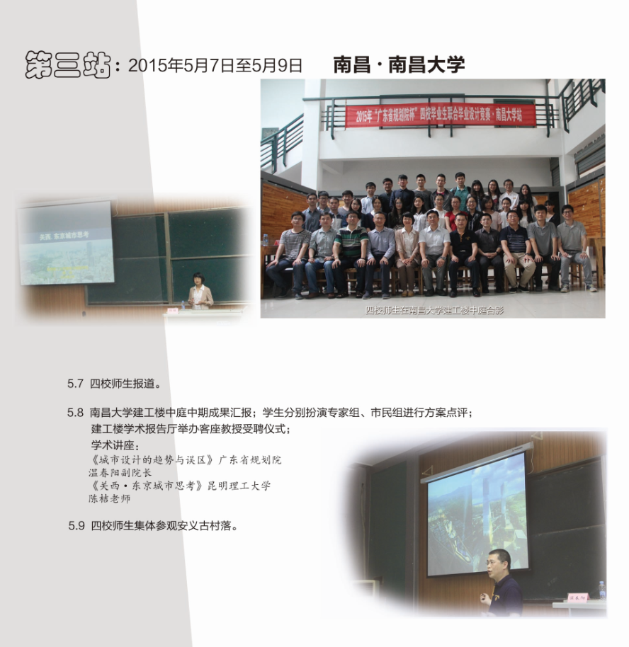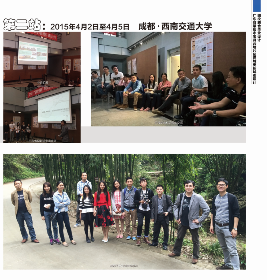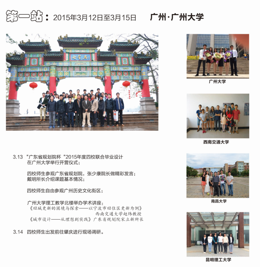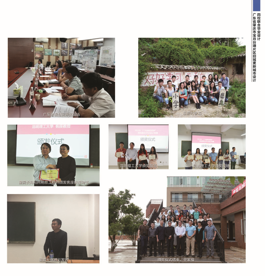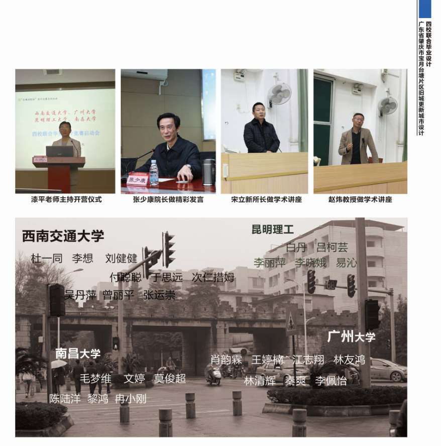 举行。本次参加的学校是:广州大学、西南交通大学、南昌大学和昆明理工大学。设计题目为“肇庆市端州区旧城历史文化核心区更新城市设计”。在这次的教学活动中,所有参加的同学,他们认真调研、大胆表现;各高校的指导老师们认真负责,积极引导并耐心指导每位学生;广东省规院马总等同仁在教学活动中负责任的点评和打分,他们无私奉献、与整个教学活动一路相伴,在大家的共同努力下,本次联合毕业设计圆满结束。