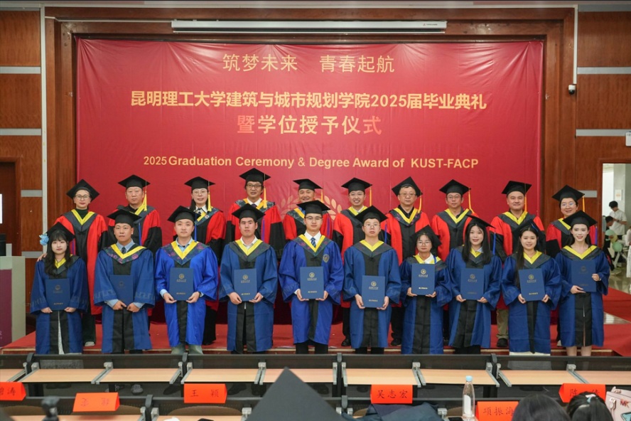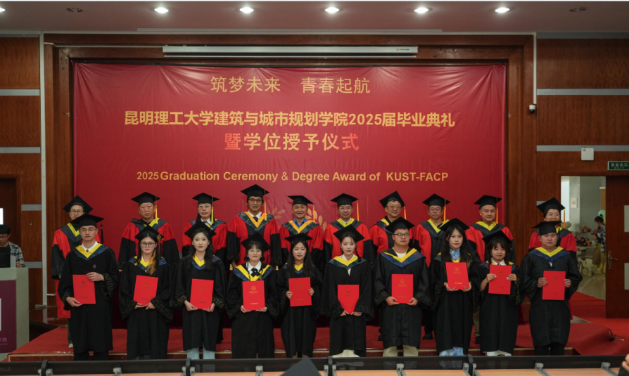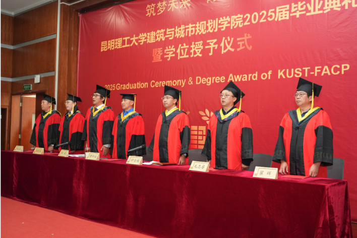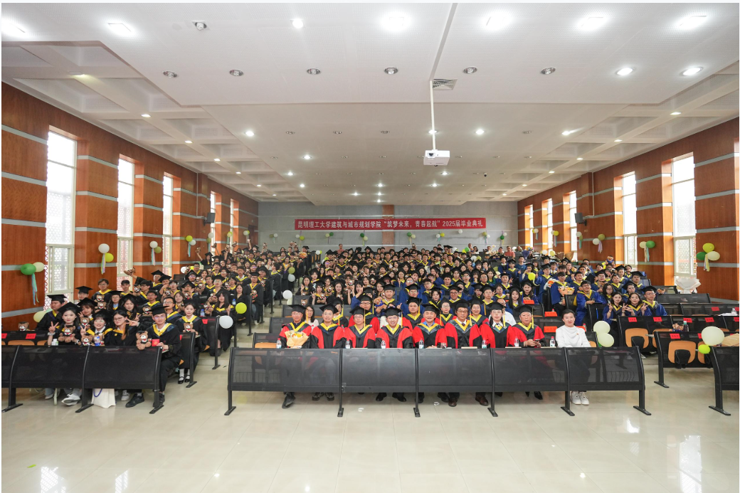 2025届毕业典礼暨学位授予仪式在建筑楼200隆重举行。典礼由学院党委副书记余红珍主持,昆明理工大学周峰越教授、学院党委钟金栋书记,学院杨毅院长、谭良斌副院长、毛志睿副院长、学院学位分委员会成员、教师代表、班主任、辅导员,以及2025届166位本科生与125位硕士研究生和部分学生家长共同参与并见证这一重要时刻。