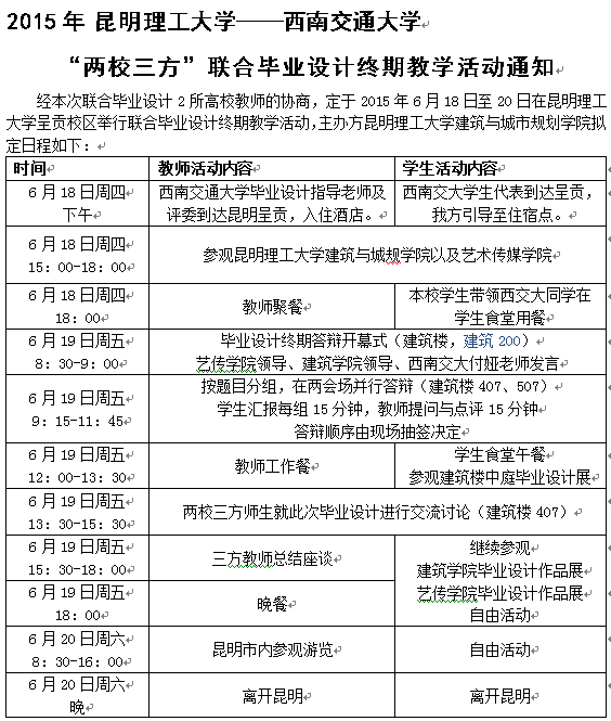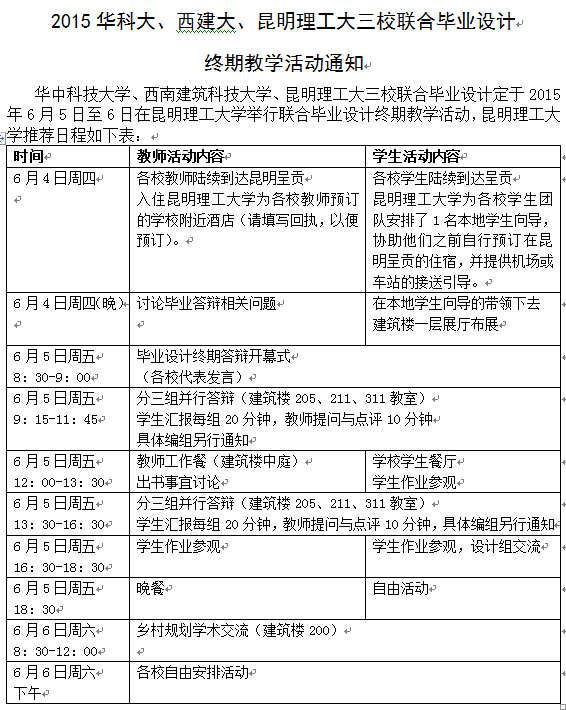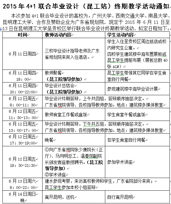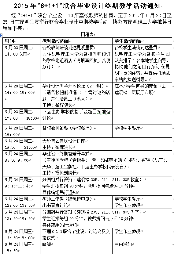 以下为与国内高校的四个联合毕业设计终期教学活动安排表: